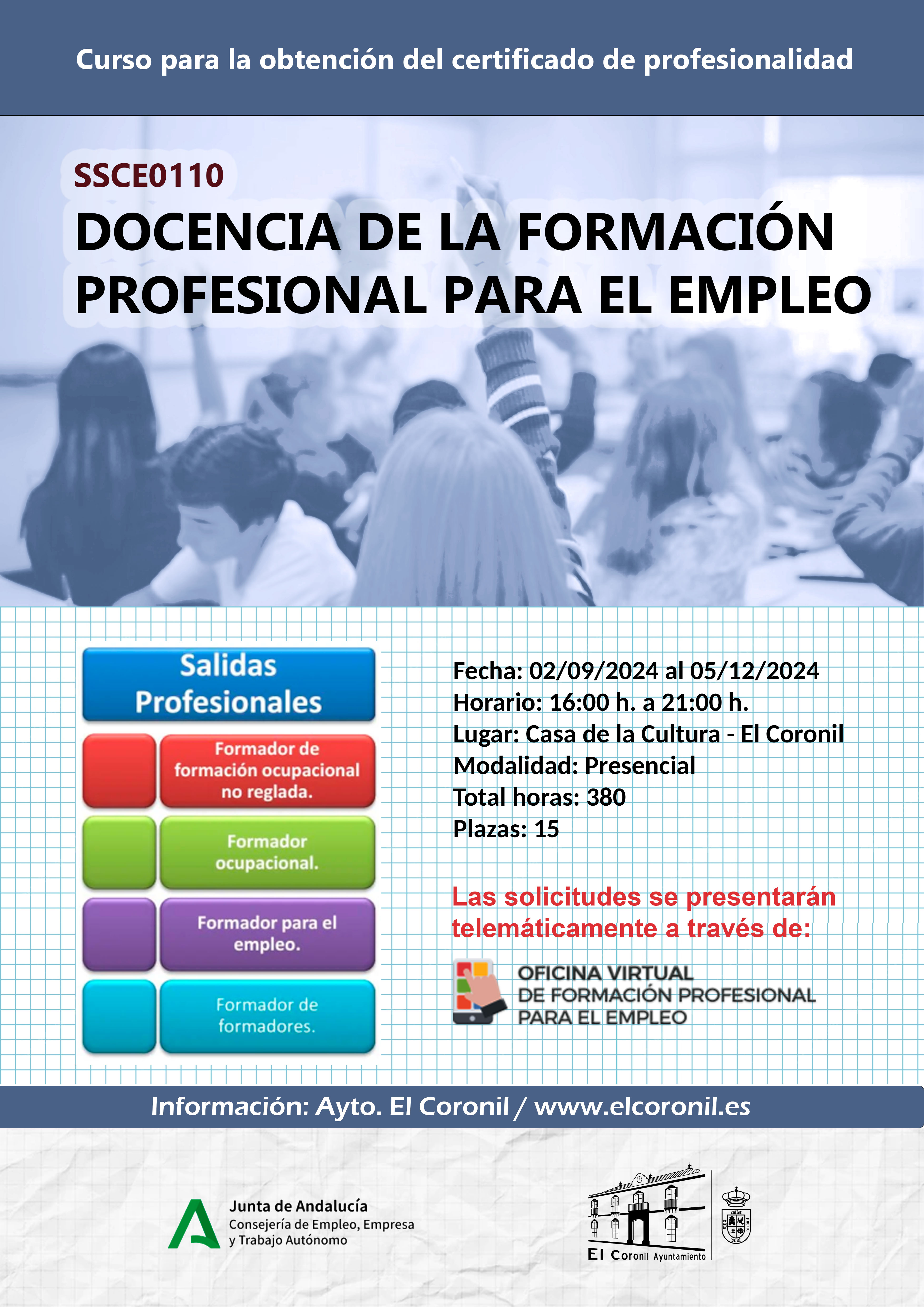 Curso para la obtención del certificado de profesionalidad "SSCE0110 Docencia de la formación profesional para el empleo"